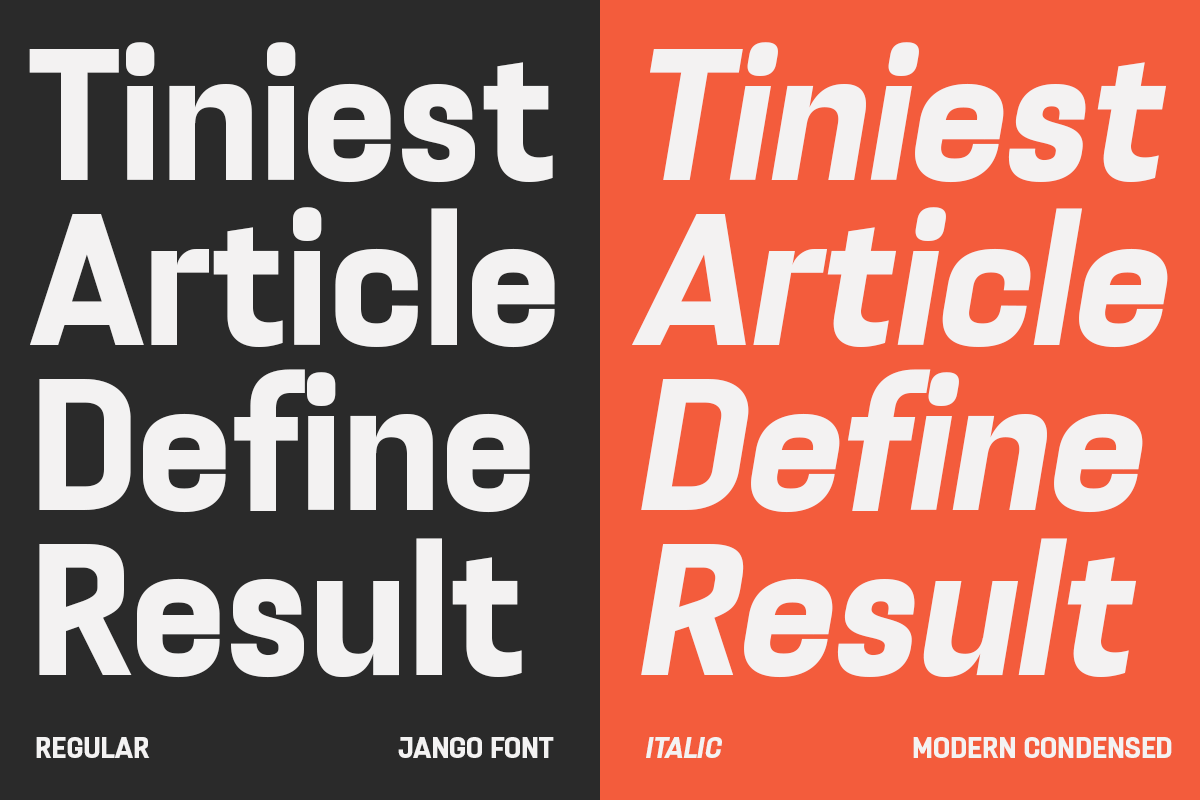 Crafted for designers who value bold simplicity, JANGO delivers a professional and futuristic look that’s ideal for , technology, architecture, and creative industries. Its condensed style maximizes space without compromising readability, making it great for minimalist compositions and digital branding systems.
