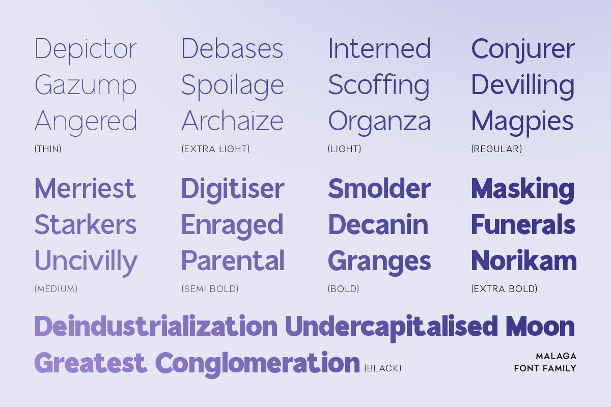 Featuring multiple weights, MALAGA adapts effortlessly to a wide variety of styles—from bold headline identities to subtle body text. Its smooth curves and consistent rhythm provide a professional and timeless aesthetic ideal for corporate brands, creative studios, tech companies, and lifestyle products.